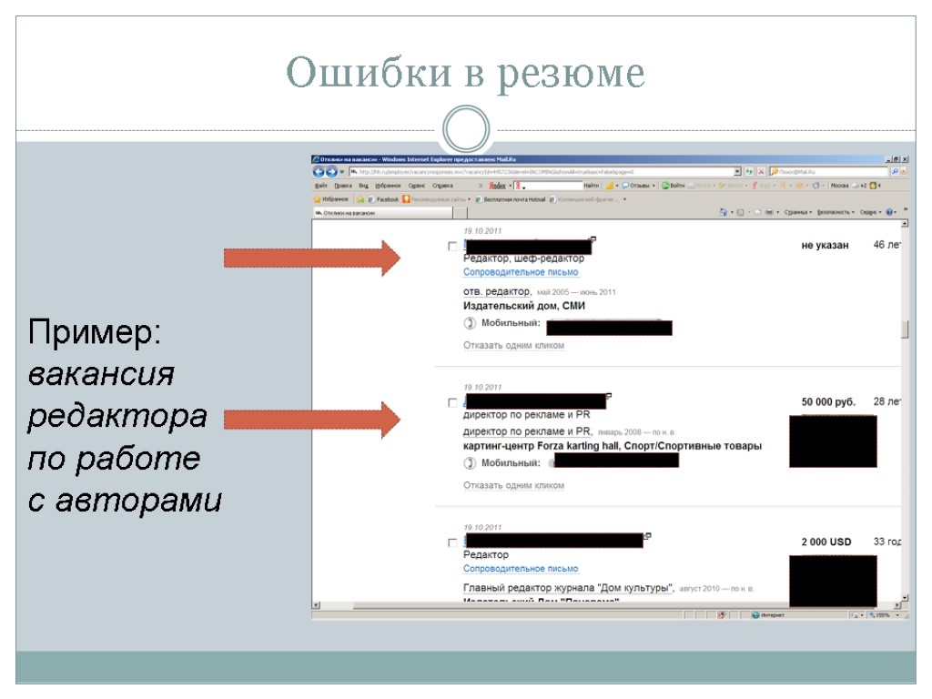 Ошибки в резюме 10. Не адаптация резюме под конкретного работодателя, рассылка резюме веером Пример: вакансия редактора по работе с авторами