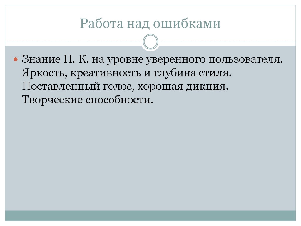 Работа над ошибками Знание П. К. на уровне уверенного пользователя. Яркость, креативность и глубина стиля. Поставленный голос, хорошая дикция. Творческие способности.