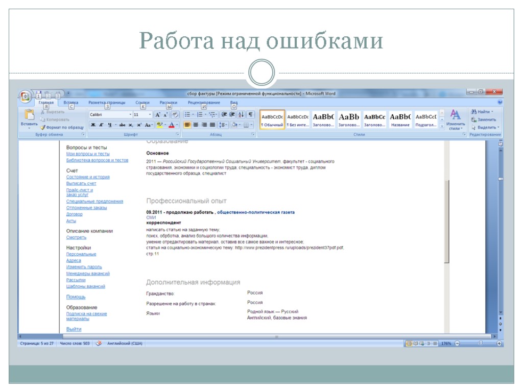 Ошибки в резюме 4. Отсутствие «нужной» информации в резюме: описания деятельности компаний, особенно когда она маленькая и неизвестная описания должностных обязанностей описания достижений несоответствие названия должности обязанностям и т.п.