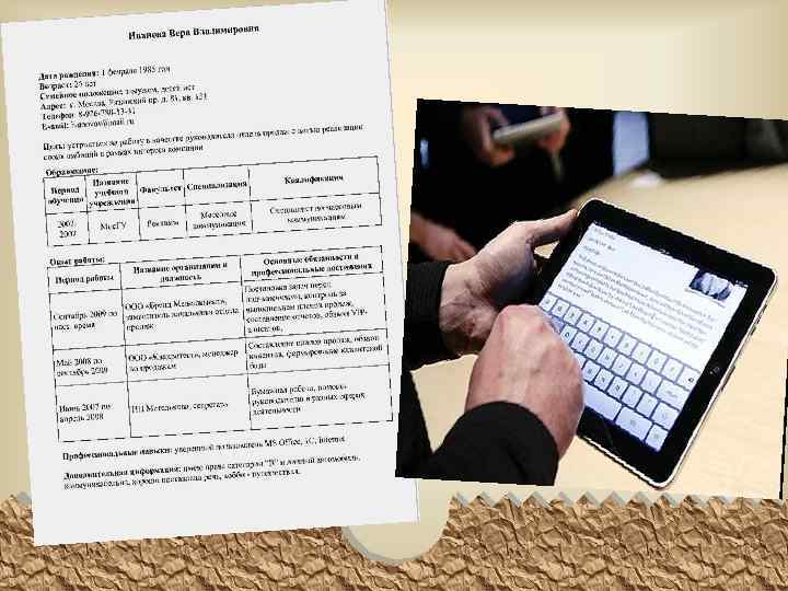 1. Личные данные 1. ФИО 2. Адрес (постоянный, временный срок) 3. Телефоны (раб. , дом. , сот. – время звонков) 4. E-mail, факс 5. Дата рождения