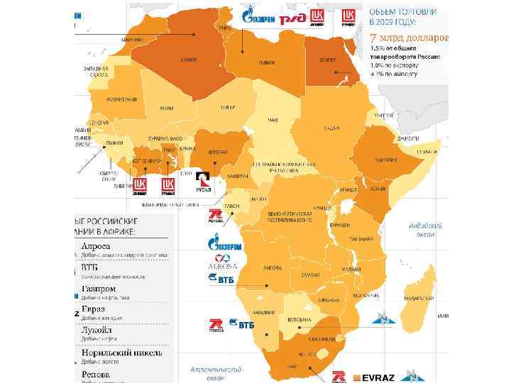 • К началу ХХI века внешнеторговый оборот России со странами африканского континента уменьшился в 3, 5 раза с $2, 7 млрд. в 1994 г. • 2010 г. - российско-африканская торговля достигла $2 млрд. Но в товарообороте всего континента ($250 млрд. ) доля России не превышает 1 %(!) • НО значительная часть российской продукции - грузовиков, тракторов, станков и промышленного оборудования - поставляется через Европу и Дубаи как посредническими фирмами Франции, Бельгии, так и российскими, зарегистрированные в оффшорах