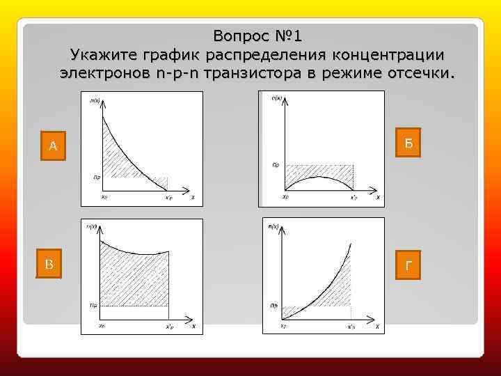 Вопрос № 1 Укажите график распределения концентрации электронов n-p-n транзистора в режиме отсечки. А В Б Г