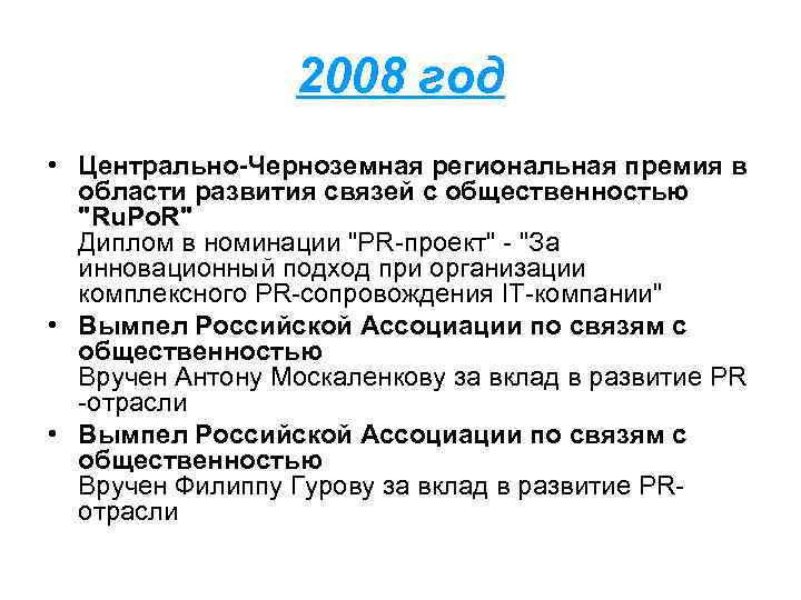 2008 год • Центрально-Черноземная региональная премия в области развития связей с общественностью "Ru. Po. R" Диплом в номинации "PR-проект" - "За инновационный подход при организации комплексного PR-сопровождения IT-компании" • Вымпел Российской Ассоциации по связям с общественностью Вручен Антону Москаленкову за вклад в развитие PR -отрасли • Вымпел Российской Ассоциации по связям с общественностью Вручен Филиппу Гурову за вклад в развитие PRотрасли