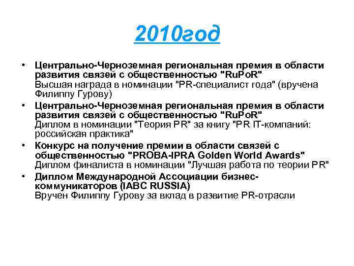 2010 год • Центрально-Черноземная региональная премия в области развития связей с общественностью "Ru. Po. R" Высшая награда в номинации "PR-специалист года" (вручена Филиппу Гурову) • Центрально-Черноземная региональная премия в области развития связей с общественностью "Ru. Po. R" Диплом в номинации "Теория PR" за книгу "PR IT-компаний: российская практика" • Конкурс на получение премии в области связей с общественностью "PROBA-IPRA Golden World Awards" Диплом финалиста в номинации "Лучшая работа по теории PR" • Диплом Международной Ассоциации бизнескоммуникаторов (IABC RUSSIA) Вручен Филиппу Гурову за вклад в развитие PR-отрасли