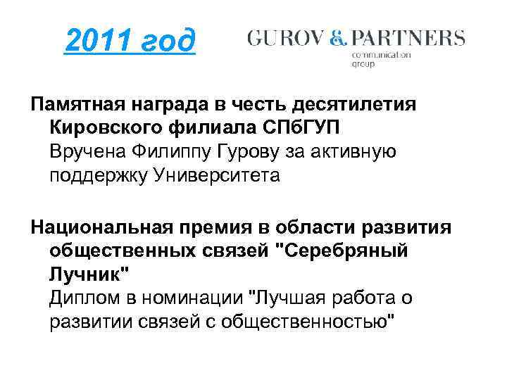 2011 год Памятная награда в честь десятилетия Кировского филиала СПб. ГУП Вручена Филиппу Гурову за активную поддержку Университета Национальная премия в области развития общественных связей "Серебряный Лучник" Диплом в номинации "Лучшая работа о развитии связей с общественностью"