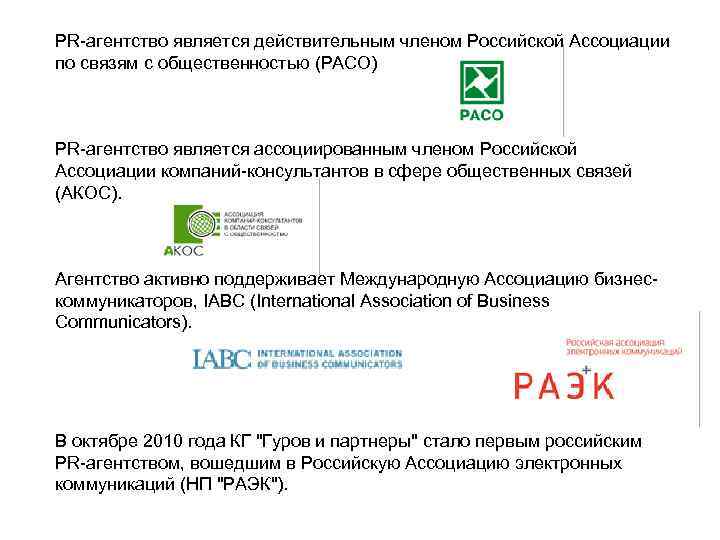 PR-агентство является действительным членом Российской Ассоциации по связям с общественностью (РАСО) PR-агентство является ассоциированным членом Российской Ассоциации компаний-консультантов в сфере общественных связей (АКОС). Агентство активно поддерживает Международную Ассоциацию бизнескоммуникаторов, IABC (International Association of Business Communicators). В октябре 2010 года КГ "Гуров и партнеры" стало первым российским PR-агентством, вошедшим в Российскую Ассоциацию электронных коммуникаций (НП "РАЭК").