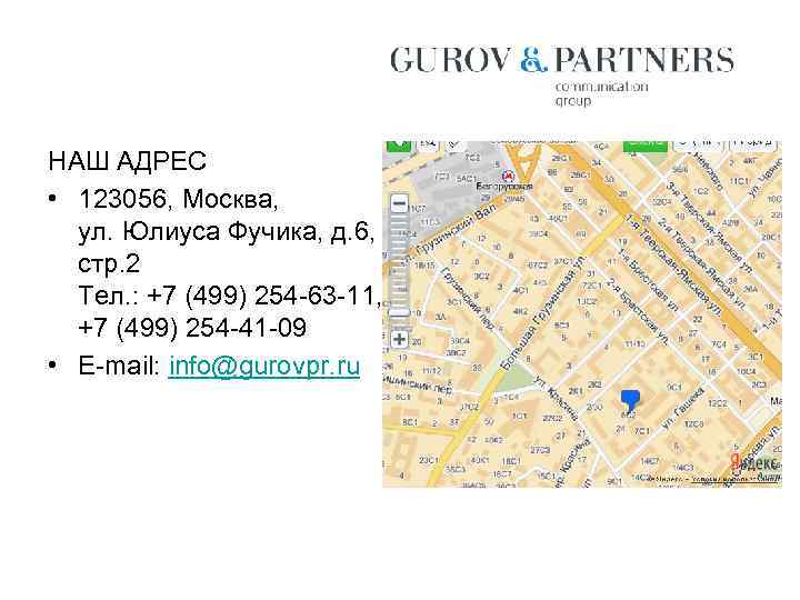 НАШ АДРЕС • 123056, Москва, ул. Юлиуса Фучика, д. 6, стр. 2 Тел. : +7 (499) 254 -63 -11, +7 (499) 254 -41 -09 • E-mail: info@gurovpr. ru