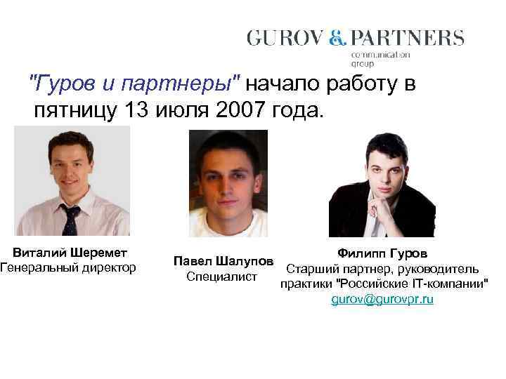 "Гуров и партнеры" начало работу в пятницу 13 июля 2007 года. Виталий Шеремет Генеральный директор Филипп Гуров Павел Шалупов Старший партнер, руководитель Специалист практики "Российские IT-компании" gurov@gurovpr. ru