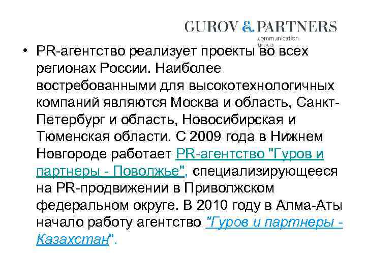 • PR-агентство реализует проекты во всех регионах России. Наиболее востребованными для высокотехнологичных компаний являются Москва и область, Санкт. Петербург и область, Новосибирская и Тюменская области. С 2009 года в Нижнем Новгороде работает PR-агентство "Гуров и партнеры - Поволжье", специализирующееся на PR-продвижении в Приволжском федеральном округе. В 2010 году в Алма-Аты начало работу агентство "Гуров и партнеры Казахстан".