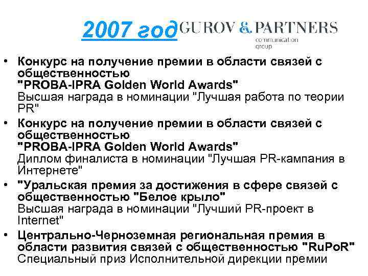 2007 год • Конкурс на получение премии в области связей с общественностью "PROBA-IPRA Golden World Awards" Высшая награда в номинации "Лучшая работа по теории PR" • Конкурс на получение премии в области связей с общественностью "PROBA-IPRA Golden World Awards" Диплом финалиста в номинации "Лучшая PR-кампания в Интернете" • "Уральская премия за достижения в сфере связей с общественностью "Белое крыло" Высшая награда в номинации "Лучший PR-проект в Internet" • Центрально-Черноземная региональная премия в области развития связей с общественностью "Ru. Po. R" Специальный приз Исполнительной дирекции премии