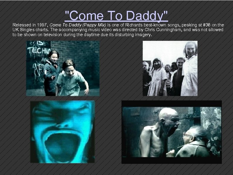 "Come To Daddy" Released in 1997, Come To Daddy (Pappy Mix) is one of Richards best-known songs, peaking at #36 on the UK Singles charts. The accompanying music video was directed by Chris Cunningham, and was not allowed to be shown on television during the daytime due its disturbing imagery.