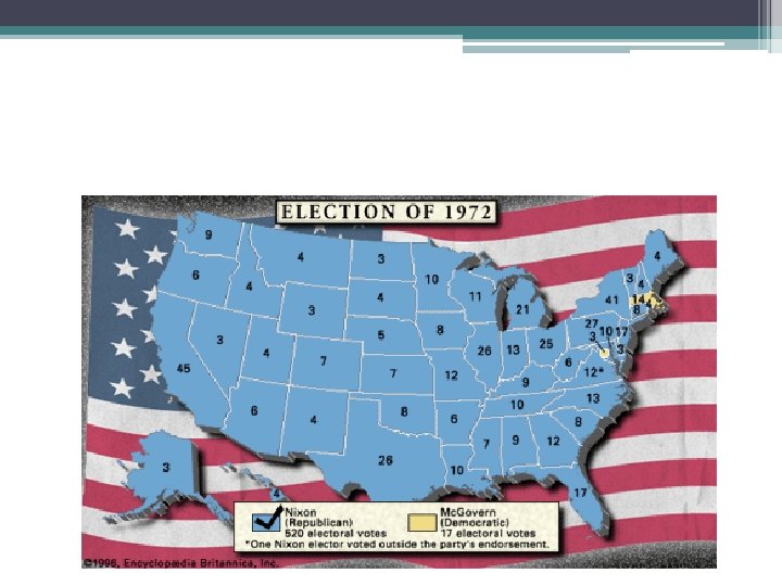 Election of 1972 • Nixon (R) vs. George Mc. Govern (D) ▫ Eventful 1 st term for Nixon ▫ “Plumbers” – respond to “leaks” of secrets & investigate political enemies ▫ (e. g. Pentagon Papers & Daniel Ellsberg’s psychiatrist) ▫ Hatched a plan to break into offices of the Democratic National Committee at the Watergate Hotel ▫ Woodward & Bernstein investigate the story ▫ Read pg. 675