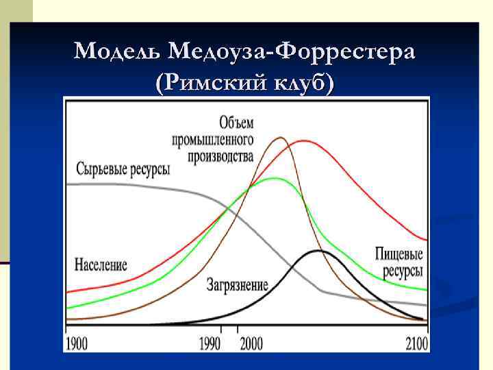 Модель Форрестера - Медоуза n В начале 70 -х годов по предложению Клуба Дж. Форрестер (США) применил разработанную им методику моделирования на ЭВМ к мировой проблематике» Результаты исследования были опубликованы в книге «Мировая динамика» (1971). Ее вывод: дальнейшее развитие человечества на физически ограниченной планете Земля приведет к экологической катастрофе в 20 -х годах ХХ-го века. n После обсуждения модели Форрестера исполнительный комитет поручил ученикам Форрестера продолжить исследование. Модель была значительно усовершенствована. По уточненным данным начало эколого-экономического коллапса было отстрочено на 40 лет. Эта работа, выполненная в Массачусетском технологическом институте (США) под руководством Д. Медоуза, нашла отражение в книге «Пределы роста» (1972). Модели Форрестера. Медоуза был придан статус первого отчета Римского Клуба.