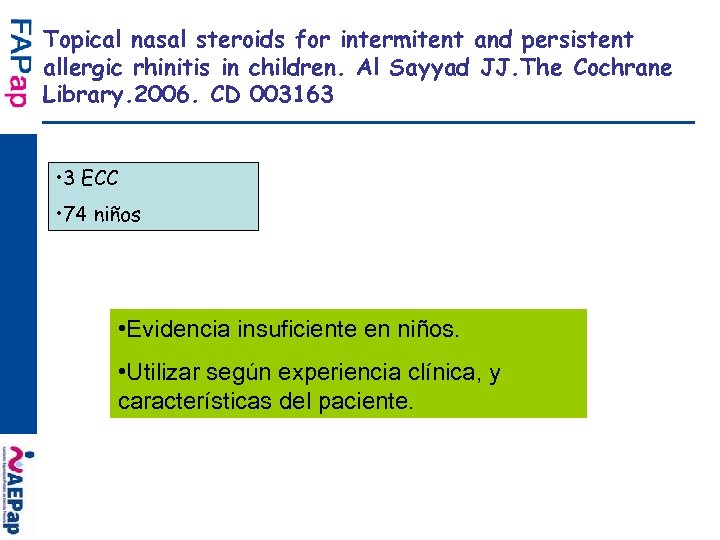 Topical nasal steroids for intermitent and persistent allergic rhinitis in children. Al Sayyad JJ. The Cochrane Library. 2006. CD 003163 • 3 ECC • 74 niños • Evidencia insuficiente en niños. • Utilizar según experiencia clínica, y características del paciente.