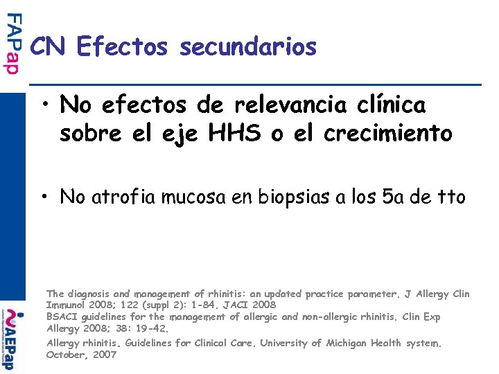 CN Efectos secundarios • No efectos de relevancia clínica sobre el eje HHS o el crecimiento • No atrofia mucosa en biopsias a los 5 a de tto The diagnosis and management of rhinitis: an updated practice parameter. J Allergy Clin Immunol 2008; 122 (suppl 2): 1 -84. JACI 2008 BSACI guidelines for the management of allergic and non-allergic rhinitis. Clin Exp Allergy 2008; 38: 19 -42. Allergy rhinitis. Guidelines for Clinical Care. University of Michigan Health system. October, 2007