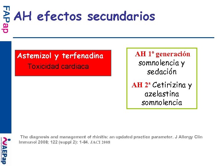 AH efectos secundarios Astemizol y terfenadina Toxicidad cardiaca AH 1º generación somnolencia y sedación AH 2ª Cetirizina y azelastina somnolencia The diagnosis and management of rhinitis: an updated practice parameter. J Allergy Clin Immunol 2008; 122 (suppl 2): 1 -84. JACI 2008