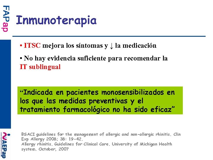 Inmunoterapia • ITSC mejora los síntomas y ↓ la medicación • No hay evidencia suficiente para recomendar la IT sublingual “Indicada en pacientes monosensibilizados en los que las medidas preventivas y el tratamiento farmacológico no ha sido eficaz” BSACI guidelines for the management of allergic and non-allergic rhinitis. Clin Exp Allergy 2008; 38: 19 -42. Allergy rhinitis. Guidelines for Clinical Care. University of Michigan Health system. October, 2007