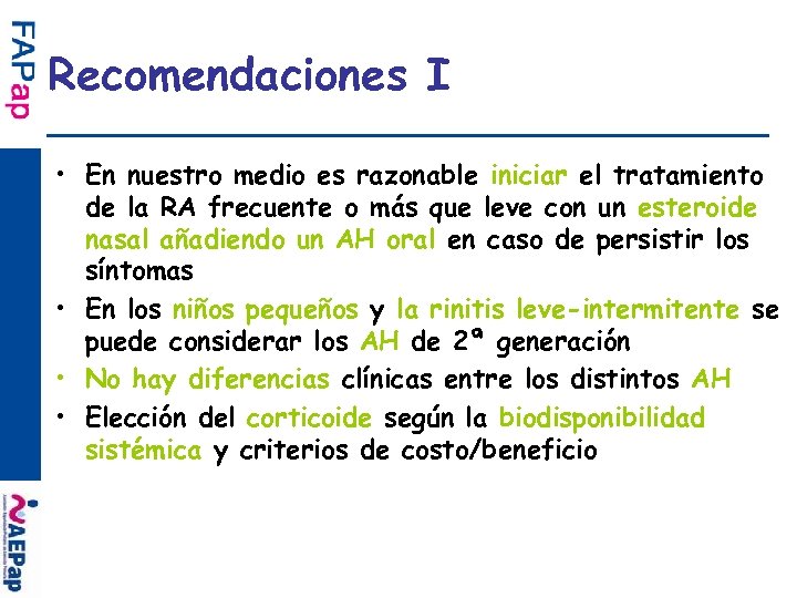 Recomendaciones I • En nuestro medio es razonable iniciar el tratamiento de la RA frecuente o más que leve con un esteroide nasal añadiendo un AH oral en caso de persistir los síntomas • En los niños pequeños y la rinitis leve-intermitente se puede considerar los AH de 2ª generación • No hay diferencias clínicas entre los distintos AH • Elección del corticoide según la biodisponibilidad sistémica y criterios de costo/beneficio
