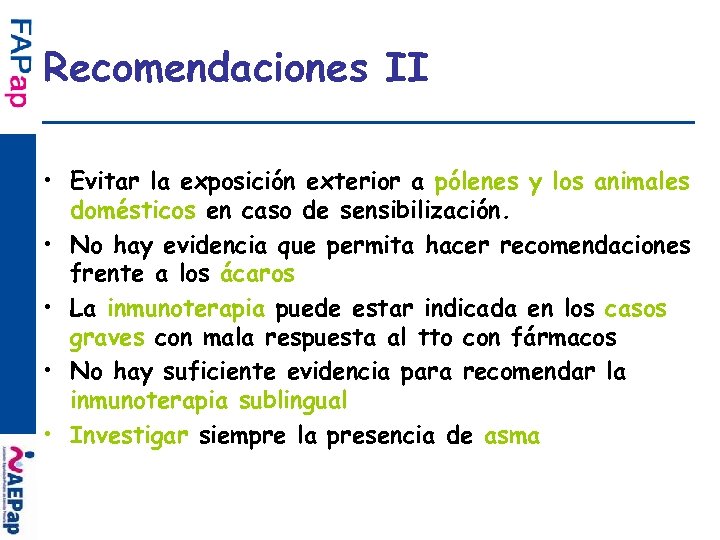 Recomendaciones II • Evitar la exposición exterior a pólenes y los animales domésticos en caso de sensibilización. • No hay evidencia que permita hacer recomendaciones frente a los ácaros • La inmunoterapia puede estar indicada en los casos graves con mala respuesta al tto con fármacos • No hay suficiente evidencia para recomendar la inmunoterapia sublingual • Investigar siempre la presencia de asma