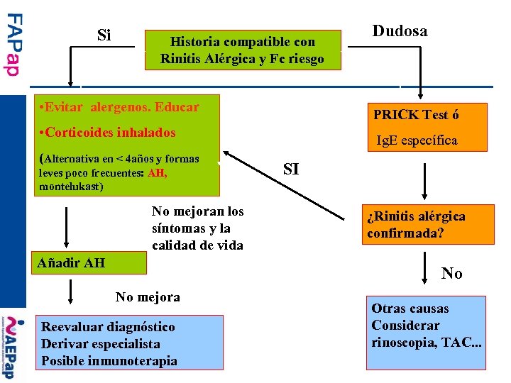 Si Historia compatible con Rinitis Alérgica y Fc riesgo • Evitar alergenos. Educar PRICK Test ó • Corticoides inhalados (Alternativa en < 4 años y formas leves poco frecuentes: AH, montelukast) No mejoran los síntomas y la calidad de vida Añadir AH Dudosa Ig. E específica SI ¿Rinitis alérgica confirmada? No No mejora Reevaluar diagnóstico Derivar especialista Posible inmunoterapia Otras causas Considerar rinoscopia, TAC. . .