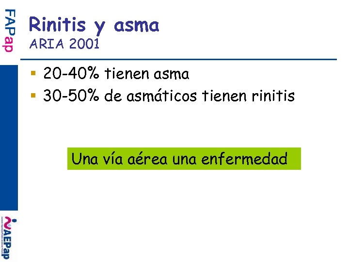 Rinitis y asma ARIA 2001 § 20 -40% tienen asma § 30 -50% de asmáticos tienen rinitis Una vía aérea una enfermedad