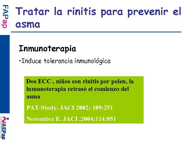 Tratar la rinitis para prevenir el asma Inmunoterapia • Induce tolerancia inmunológica Dos ECC , niños con rinitis por polen, la inmunoterapia retrasó el comienzo del asma PAT-Study. JACI 2002; 109: 251 Novembre E. JACI. 2004; 114: 851