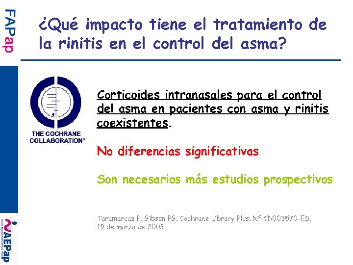 ¿Qué impacto tiene el tratamiento de la rinitis en el control del asma? Corticoides intranasales para el control del asma en pacientes con asma y rinitis coexistentes. No diferencias significativas Son necesarios más estudios prospectivos Taramarcaz P, Gibson PG. Cochrane Library Plus. Nº CD 003570 -ES. 19 de marzo de 2003