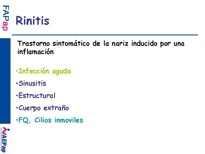 Rinitis Trastorno sintomático de la nariz inducido por una inflamación • Infección aguda • Sinusitis • Estructural • Cuerpo extraño • FQ, Cilios inmoviles