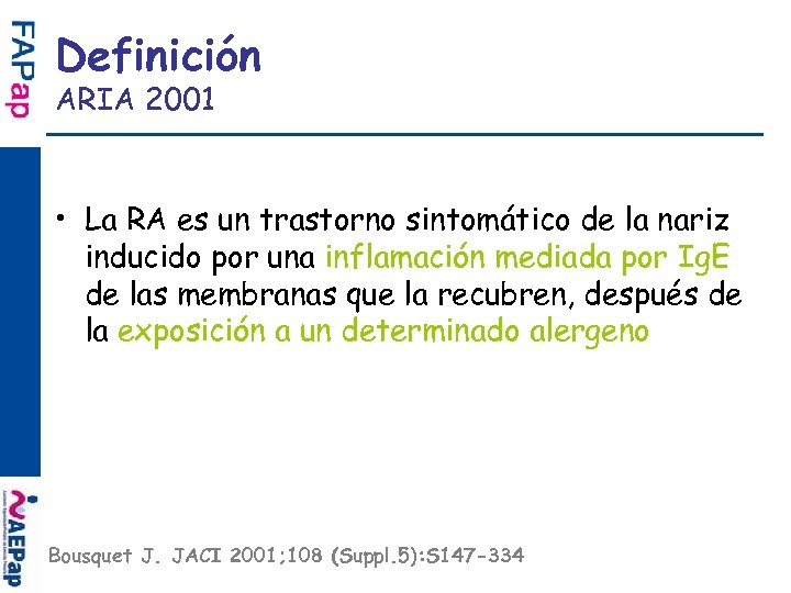 Definición ARIA 2001 • La RA es un trastorno sintomático de la nariz inducido por una inflamación mediada por Ig. E de las membranas que la recubren, después de la exposición a un determinado alergeno Bousquet J. JACI 2001; 108 (Suppl. 5): S 147 -334