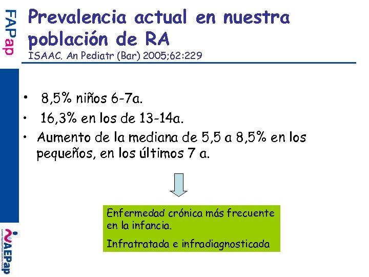 Prevalencia actual en nuestra población de RA ISAAC. An Pediatr (Bar) 2005; 62: 229 • 8, 5% niños 6 -7 a. • 16, 3% en los de 13 -14 a. • Aumento de la mediana de 5, 5 a 8, 5% en los pequeños, en los últimos 7 a. Enfermedad crónica más frecuente en la infancia. Infratratada e infradiagnosticada