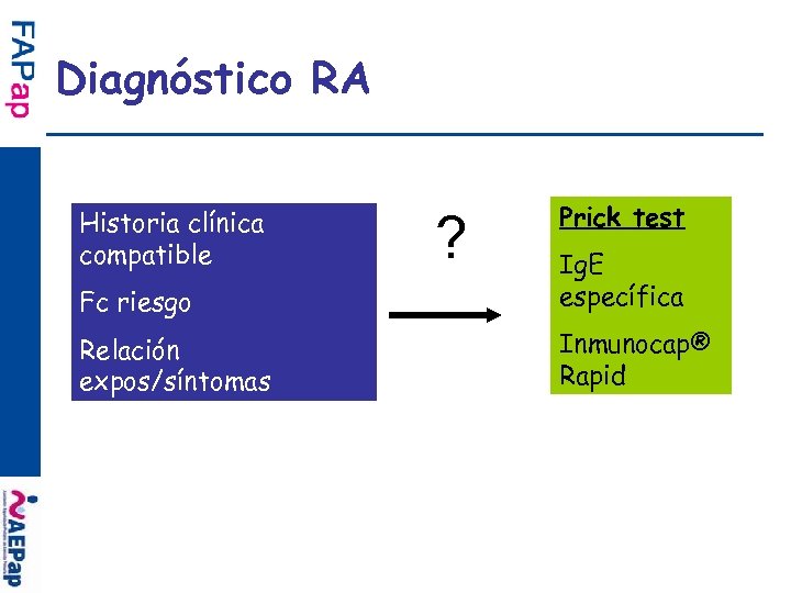 Diagnóstico RA Historia clínica compatible ? Prick test Fc riesgo Ig. E específica Relación expos/síntomas Inmunocap® Rapid