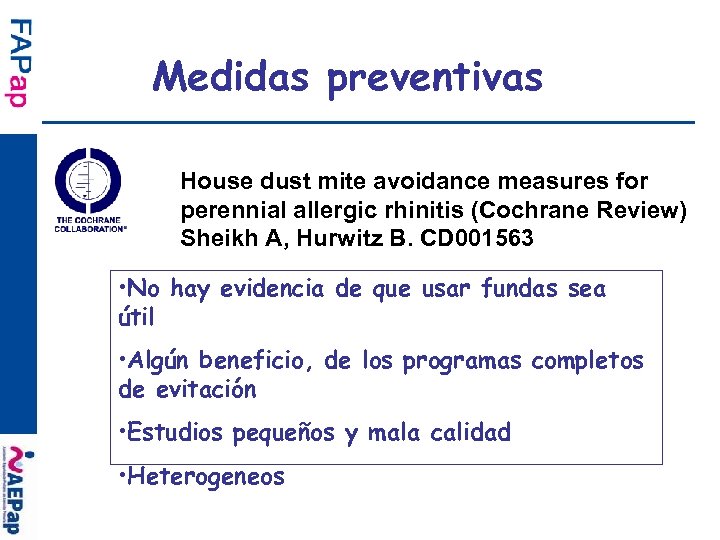 Medidas preventivas House dust mite avoidance measures for perennial allergic rhinitis (Cochrane Review) Sheikh A, Hurwitz B. CD 001563 • No hay evidencia de que usar fundas sea útil • Algún beneficio, de los programas completos de evitación • Estudios pequeños y mala calidad • Heterogeneos
