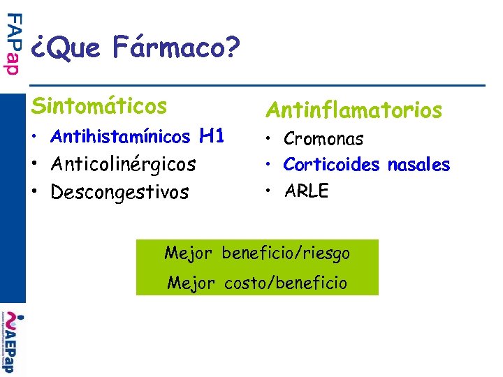 ¿Que Fármaco? Sintomáticos • Antihistamínicos H 1 • Anticolinérgicos • Descongestivos Antinflamatorios • Cromonas • Corticoides nasales • ARLE Mejor beneficio/riesgo Mejor costo/beneficio