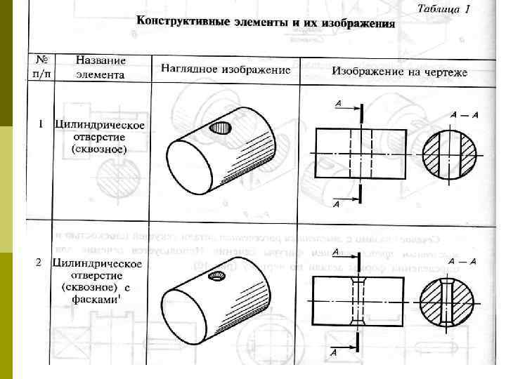 Секущие плоскости проводятся перпендикулярно к основанию детали или ее оси, то есть фигура сечения раскрывает поперечное строение детали. p Назначение сечений – максимально четко передать форму детали в конкретном месте или в месте, усложненном различными углублениями или отверстиями, которые называются конструктивными элементами. p