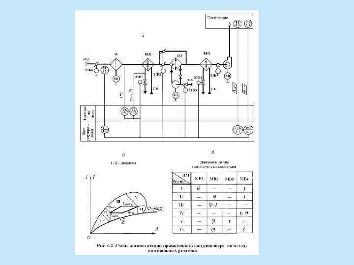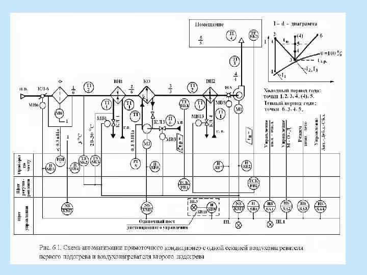 Схема № 8. Система автоматики приточно-вытяжной установки с водяным калорифером, водяным охладителем и роторным рекуператором