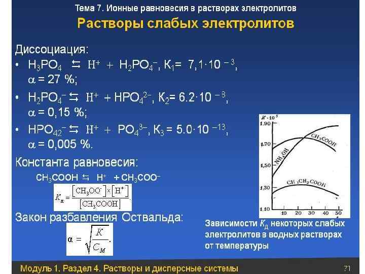 Степенью диссоциации (α) электролита называется отношение числа его молекул, распавшихся на ионы, к общему числу молекул электролита в растворе, т. е. Степень электролитической диссоциации зависит как от природы растворенного вещества, так и от концентрации раствора, увеличиваясь с его разбавлением. Электролиты можно разделить на две большие группы: сильные и слабые. Сильные электролиты (например, H 2 SO 4, HCl, HNO 3, H 3 PO 4, HCl. O 3, HCl. O 4, KOH, Na. Cl, KBr, NH 4 NO 3 и др. ) диссоциируют практически полностью. Для слабых электролитов устанавливается равновесие между недиссоциированными молекулами и ионами. К слабым электролитам относятся плохо растворимые соли,