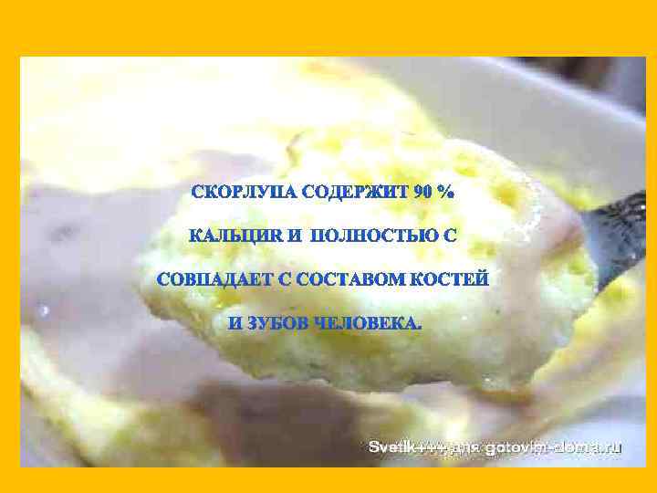 Скорлупа Скорлупу куриных яиц издревле добавляли в целебные мази. Это обусловлено тем, что яичная скорлупа состоит из кальция, и он прекрасно усваивается организмом. Костная ткань состоит из кальция. Если организм ощущает недостаток этого вещества, это вызывает у человека многие заболевания, даже у детей. Ни один источник кальция, такой как: сода, мел, не принимается организмом так, как скорлупа. Состав человеческой кости, зубов очень схож с яичной скорлупой. Польза скорлупы яиц состоит в том, что, благодаря кальцию, содержащемуся в скорлупе, костный мозг лучше выполняет кроветворную функцию.