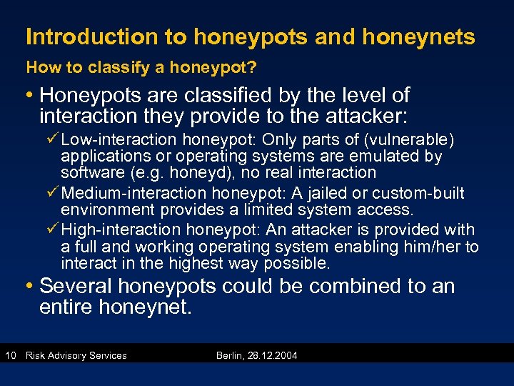 Introduction to honeypots and honeynets Downside of deploying a honeypot • Limited view: – Honeypots can only track and capture activity that directly interacts with them. Therefore honeypots will not capture attacks against other systems. • Additional risk: – Deploying a honeypot could create an additional risk and eventually put a whole organizations’ IT security at risk. • Remaining risk: – Just as all security related technologies honeypots have risk. Depending on the type of honeypot deployed there is the risk the system is being taken over by a bad guy and being used to harm other systems. This could lead to serious legal consequences. 9 Risk Advisory Services Berlin, 28. 12. 2004