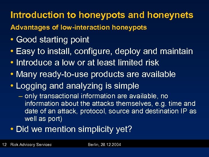 Introduction to honeypots and honeynets Low-interaction honeypots in detail • Low-interaction honeypots are typically the easiest honeypots to install, configure, deploy and maintain. • They partially emulate a service (e. g. Unix telnet server or Microsoft’s IIS) or operating system and limit the attacker’s activities to the level of emulation provided by the software. • Most importantly there is no interaction with the underlying operating system (at least there shouldn’t be). 11 Risk Advisory Services Berlin, 28. 12. 2004