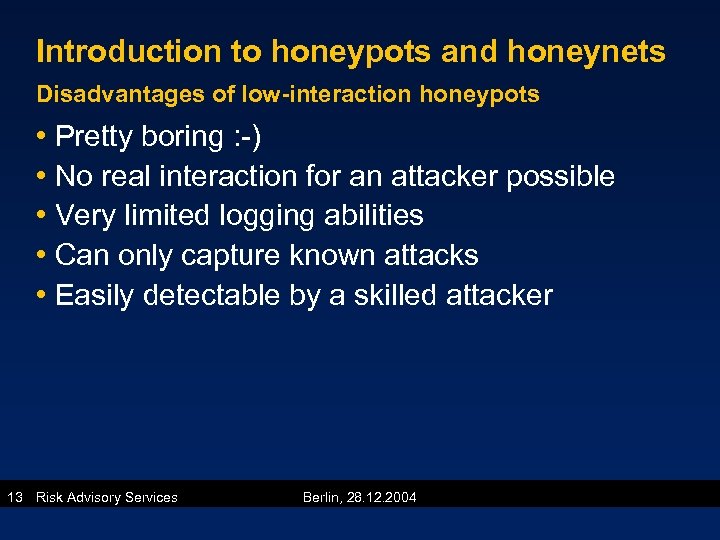Introduction to honeypots and honeynets Advantages of low-interaction honeypots • Good starting point • Easy to install, configure, deploy and maintain • Introduce a low or at least limited risk • Many ready-to-use products are available • Logging and analyzing is simple – only transactional information are available, no information about the attacks themselves, e. g. time and date of an attack, protocol, source and destination IP as well as port) • Did we mention simplicity yet? 12 Risk Advisory Services Berlin, 28. 12. 2004