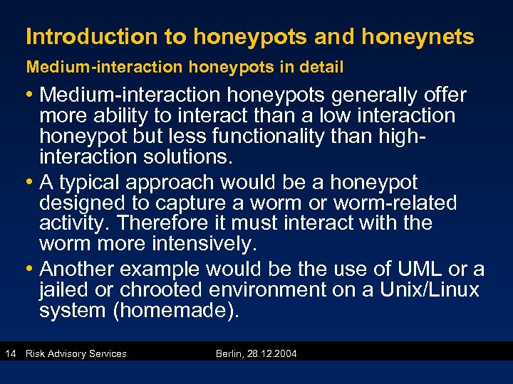 Introduction to honeypots and honeynets Disadvantages of low-interaction honeypots • Pretty boring : -) • No real interaction for an attacker possible • Very limited logging abilities • Can only capture known attacks • Easily detectable by a skilled attacker 13 Risk Advisory Services Berlin, 28. 12. 2004