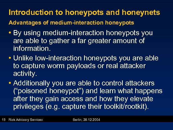 Introduction to honeypots and honeynets Medium-interaction honeypots in detail • Medium-interaction honeypots generally offer more ability to interact than a low interaction honeypot but less functionality than highinteraction solutions. • A typical approach would be a honeypot designed to capture a worm or worm-related activity. Therefore it must interact with the worm more intensively. • Another example would be the use of UML or a jailed or chrooted environment on a Unix/Linux system (homemade). 14 Risk Advisory Services Berlin, 28. 12. 2004