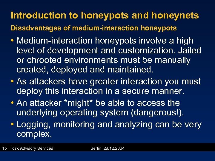 Introduction to honeypots and honeynets Advantages of medium-interaction honeypots • By using medium-interaction honeypots you are able to gather a far greater amount of information. • Unlike low-interaction honeypots you are able to capture worm payloads or real attacker activity. • Additionally you are able to control attackers (“poisoned honeypot”) and learn what happens after they gain access and how they elevate privileges (e. g. capture their toolkit/rootkit). 15 Risk Advisory Services Berlin, 28. 12. 2004