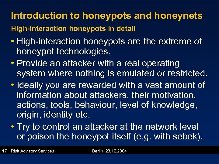 Introduction to honeypots and honeynets Disadvantages of medium-interaction honeypots • Medium-interaction honeypots involve a high level of development and customization. Jailed or chrooted environments must be manually created, deployed and maintained. • As attackers have greater interaction you must deploy this interaction in a secure manner. • An attacker *might* be able to access the underlying operating system (dangerous!). • Logging, monitoring and analyzing can be very complex. 16 Risk Advisory Services Berlin, 28. 12. 2004