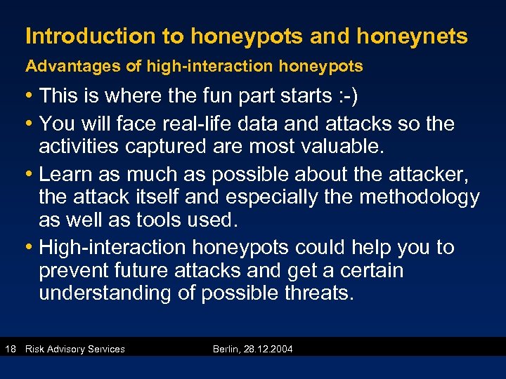 Introduction to honeypots and honeynets High-interaction honeypots in detail • High-interaction honeypots are the extreme of honeypot technologies. • Provide an attacker with a real operating system where nothing is emulated or restricted. • Ideally you are rewarded with a vast amount of information about attackers, their motivation, actions, tools, behaviour, level of knowledge, origin, identity etc. • Try to control an attacker at the network level or poison the honeypot itself (e. g. with sebek). 17 Risk Advisory Services Berlin, 28. 12. 2004