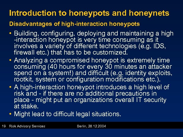Introduction to honeypots and honeynets Advantages of high-interaction honeypots • This is where the fun part starts : -) • You will face real-life data and attacks so the activities captured are most valuable. • Learn as much as possible about the attacker, the attack itself and especially the methodology as well as tools used. • High-interaction honeypots could help you to prevent future attacks and get a certain understanding of possible threats. 18 Risk Advisory Services Berlin, 28. 12. 2004
