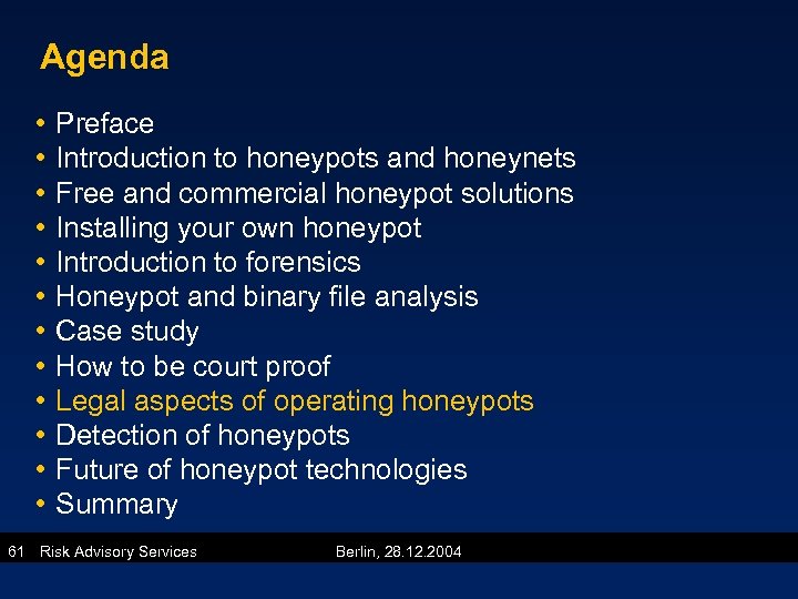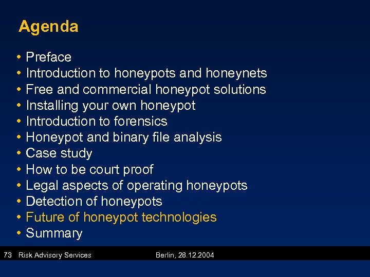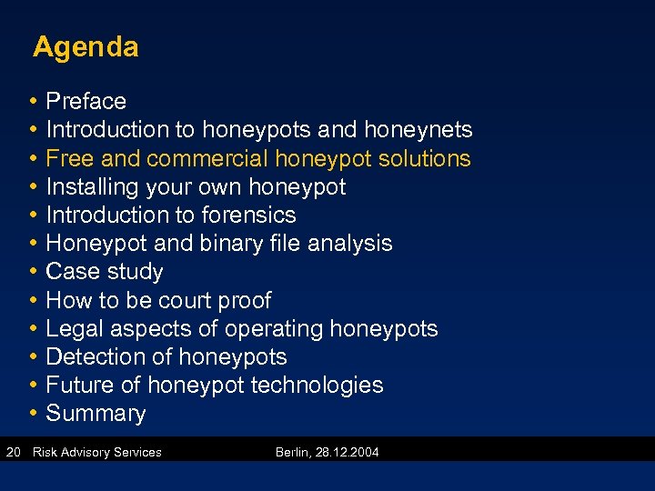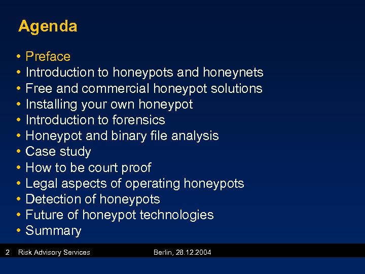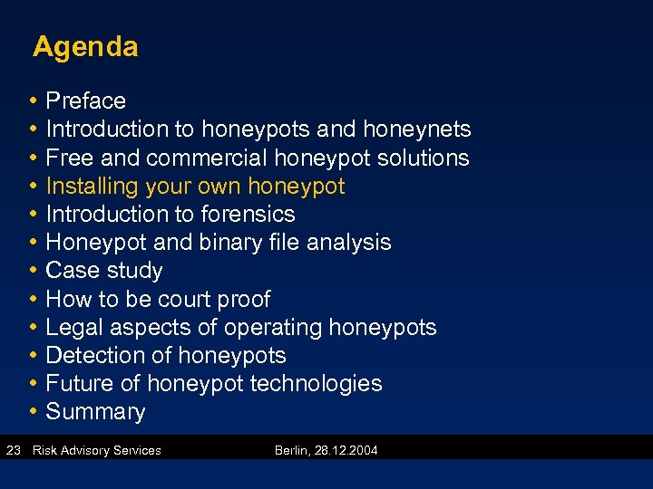 Agenda • • • 2 Preface Introduction to honeypots and honeynets Free and commercial honeypot solutions Installing your own honeypot Introduction to forensics Honeypot and binary file analysis Case study How to be court proof Legal aspects of operating honeypots Detection of honeypots Future of honeypot technologies Summary Risk Advisory Services Berlin, 28. 12. 2004