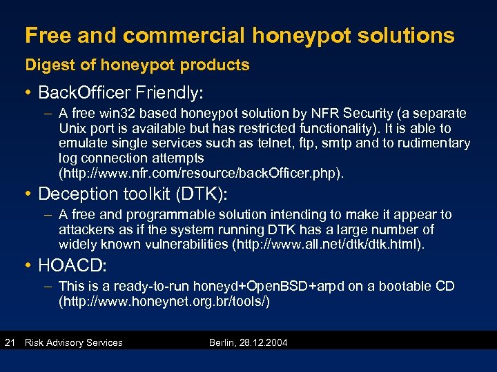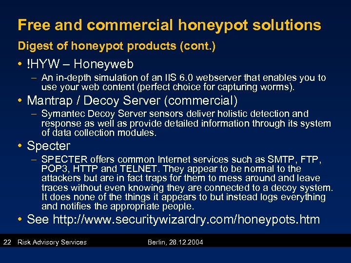 Free and commercial honeypot solutions Digest of honeypot products • Back. Officer Friendly: – A free win 32 based honeypot solution by NFR Security (a separate Unix port is available but has restricted functionality). It is able to emulate single services such as telnet, ftp, smtp and to rudimentary log connection attempts (http: //www. nfr. com/resource/back. Officer. php). • Deception toolkit (DTK): – A free and programmable solution intending to make it appear to attackers as if the system running DTK has a large number of widely known vulnerabilities (http: //www. all. net/dtk. html). • HOACD: – This is a ready-to-run honeyd+Open. BSD+arpd on a bootable CD (http: //www. honeynet. org. br/tools/) 21 Risk Advisory Services Berlin, 28. 12. 2004