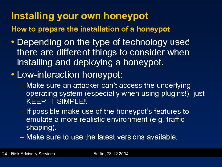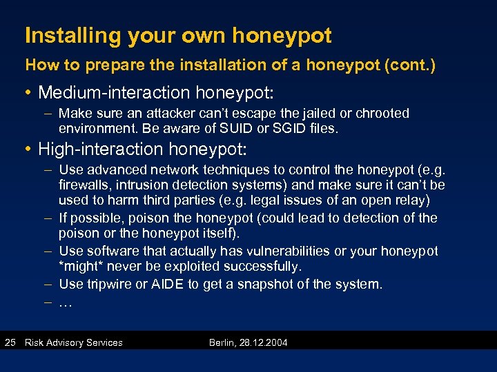 Installing your own honeypot How to prepare the installation of a honeypot • Depending on the type of technology used there are different things to consider when installing and deploying a honeypot. • Low-interaction honeypot: – Make sure an attacker can’t access the underlying operating system (especially when using plugins!), just KEEP IT SIMPLE!. – If possible make use of the honeypot’s features to emulate a more realistic environment (e. g. traffic shaping). – Make sure to use the latest versions available. 24 Risk Advisory Services Berlin, 28. 12. 2004
