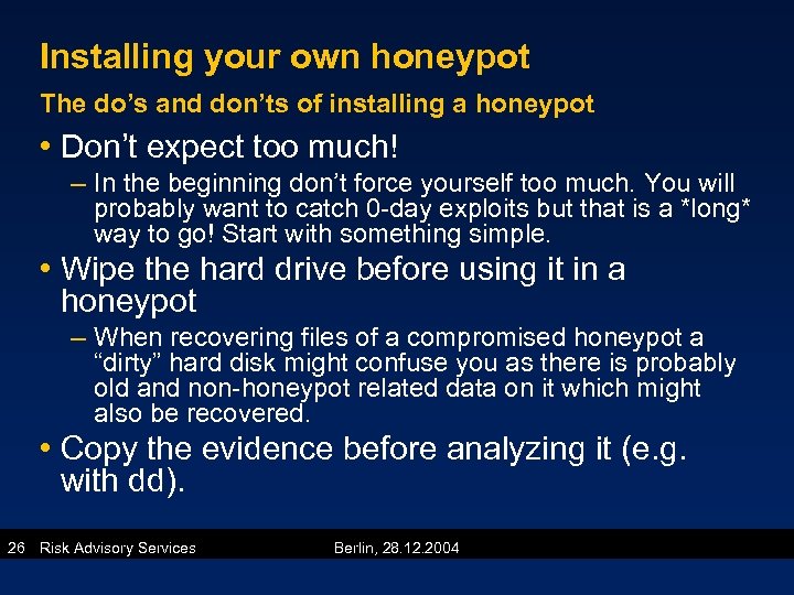 Installing your own honeypot How to prepare the installation of a honeypot (cont. ) • Medium-interaction honeypot: – Make sure an attacker can’t escape the jailed or chrooted environment. Be aware of SUID or SGID files. • High-interaction honeypot: – Use advanced network techniques to control the honeypot (e. g. firewalls, intrusion detection systems) and make sure it can’t be used to harm third parties (e. g. legal issues of an open relay) – If possible, poison the honeypot (could lead to detection of the poison or the honeypot itself). – Use software that actually has vulnerabilities or your honeypot *might* never be exploited successfully. – Use tripwire or AIDE to get a snapshot of the system. – … 25 Risk Advisory Services Berlin, 28. 12. 2004